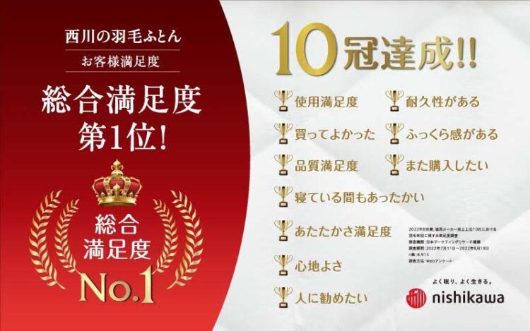 西川の羽毛布団は、「お客様満足度 総合 No.1」を含む 10 冠受賞実績 を持っています。