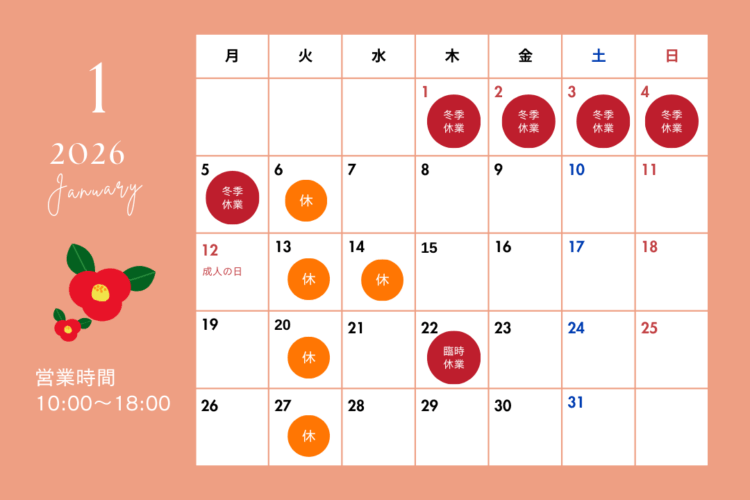 12月、2026年1月は、年末年始の休業に加え、セール準備のため臨時休業をいただきます。どうぞよろしくお願い致します。