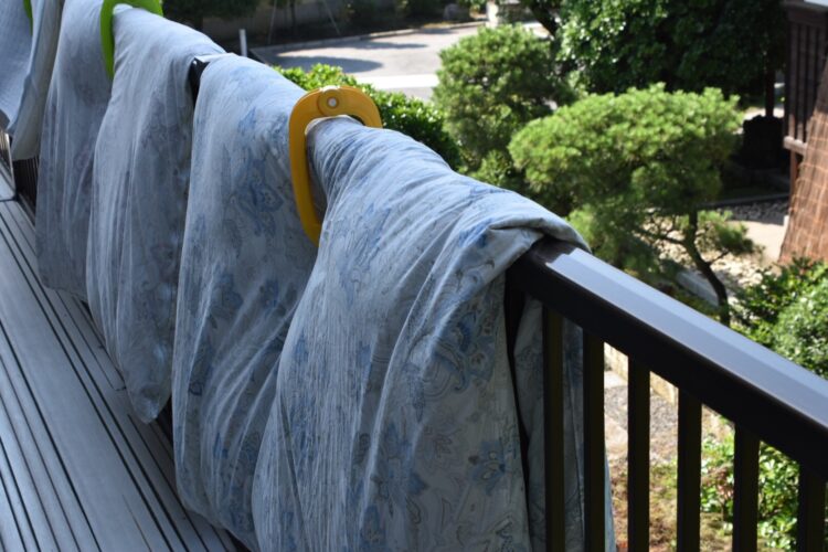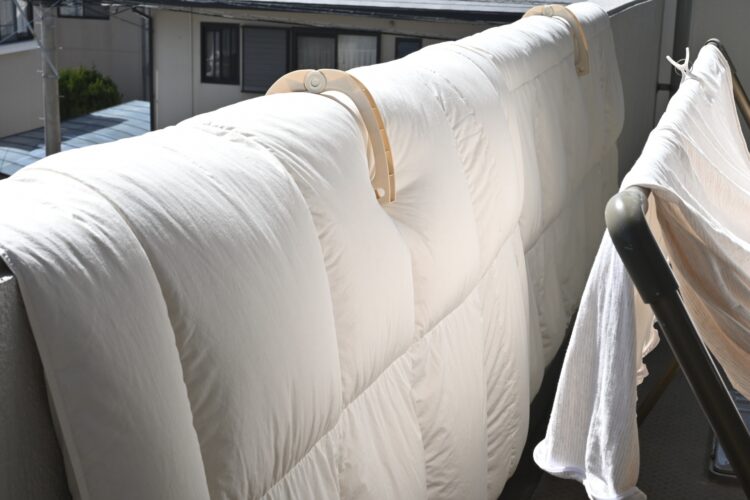 羽毛布団をご使用中の季節は、晴れた日に風通しのよい場所で軽く干すだけで、湿気が抜けてふっくら感が戻ります。直射日光が強い日は、生地が傷みやすいので日陰干しがおすすめ。日向に干す場合も1時間ほどを目安にしましょう。