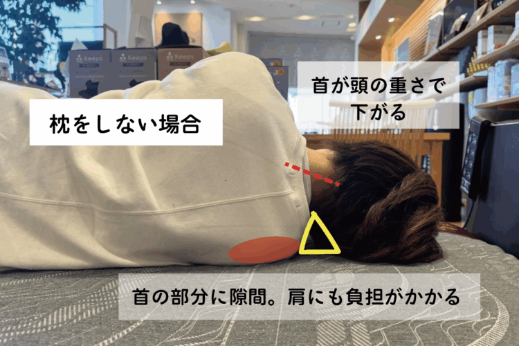 「とても低い枕」が合う方は「高い枕を当てるよりも、枕がない方がラク」と感じることが多いです。