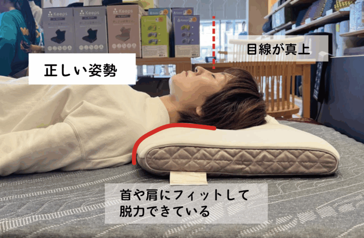 このカーブが 枕から浮くわけでもなく、枕に強く当たるわけでもなく、適切に支えられていれば、首や肩の筋肉は脱力モードに入ります。