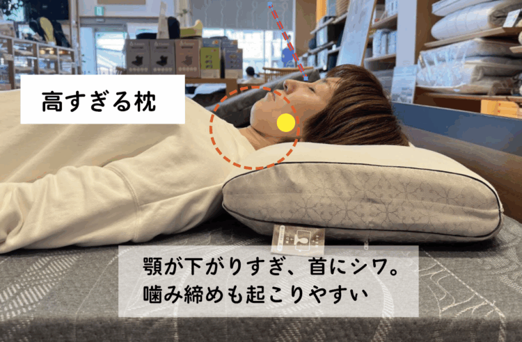 枕の「後頭部」部分がが高すぎると、顎が引きすぎた状態になります。